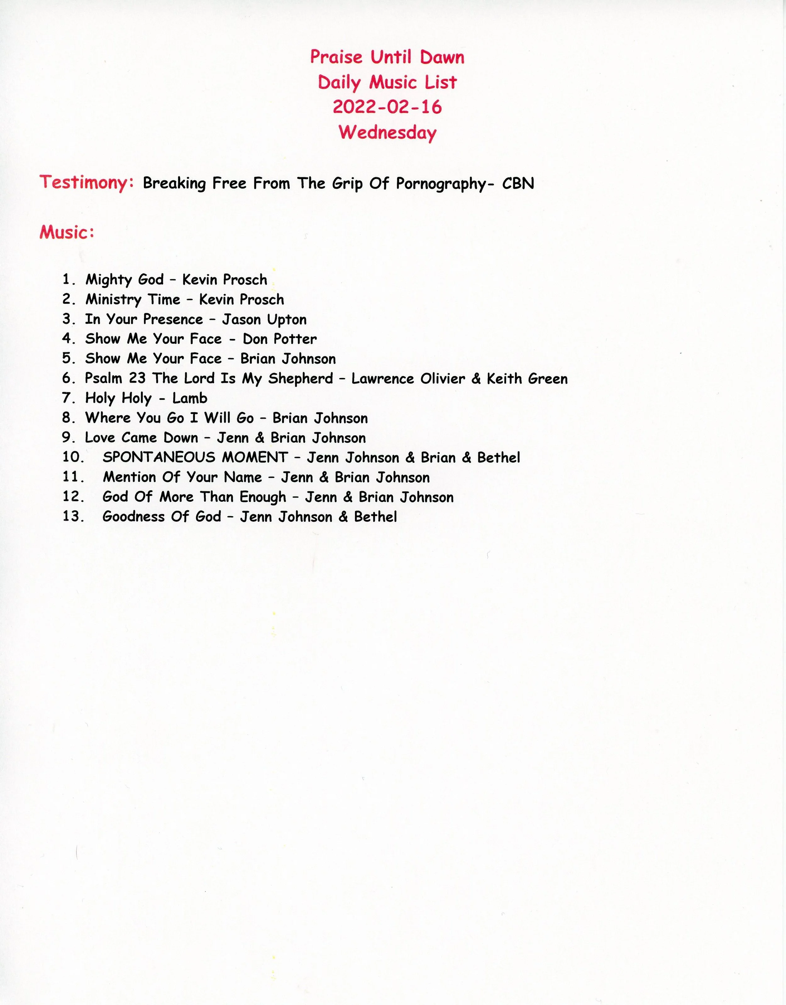"Praise Until Dawn" Playlist Wednesday 2022-02-16 Pat RutherfordApril 14, 2022 Facebook0 Twitter 0 Likes