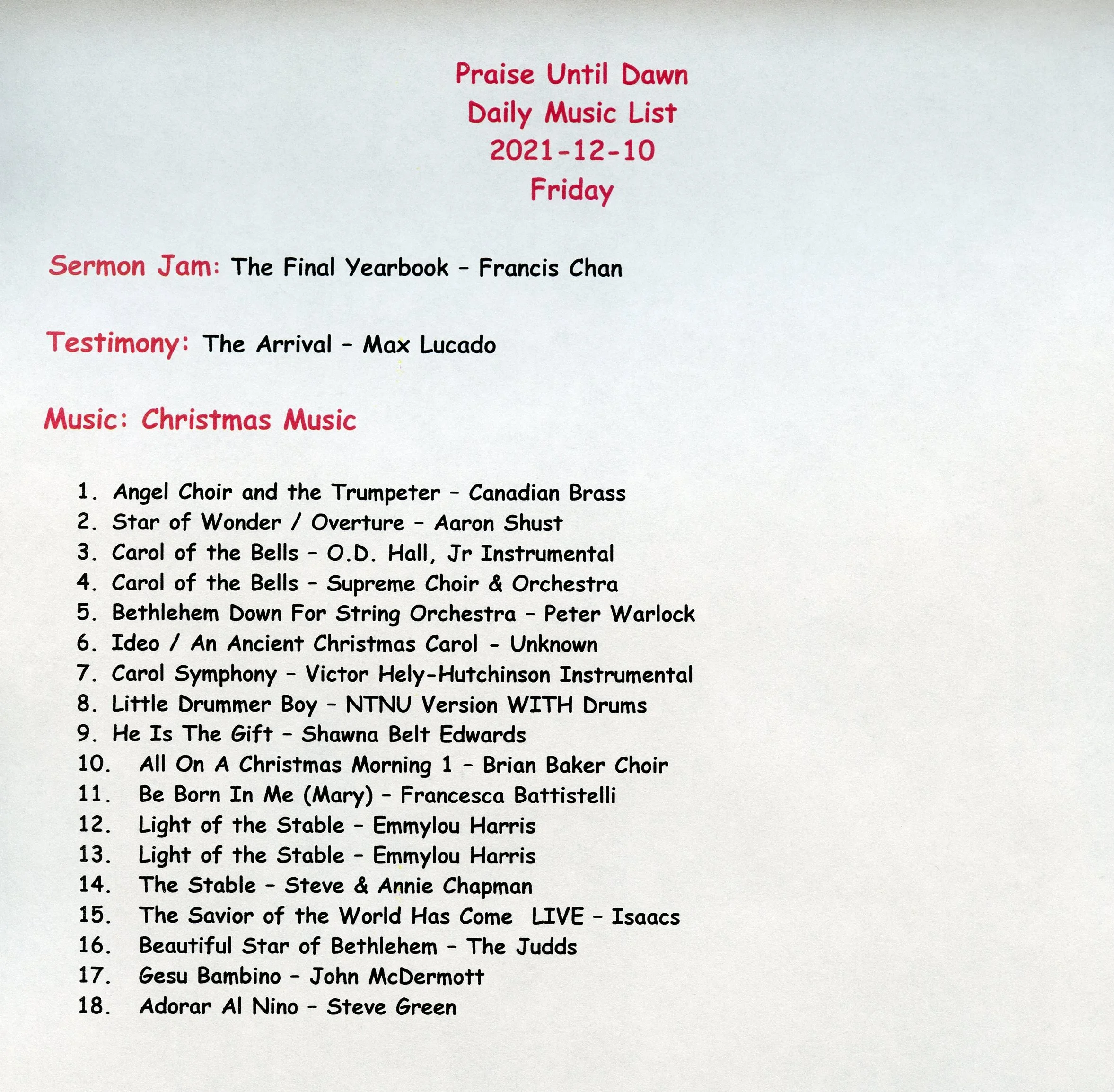 "Praise Until Dawn" Christmas Music Played On Friday 2021-12-10 Pat RutherfordDecember 10, 2021 Facebook0 Twitter 0 Likes