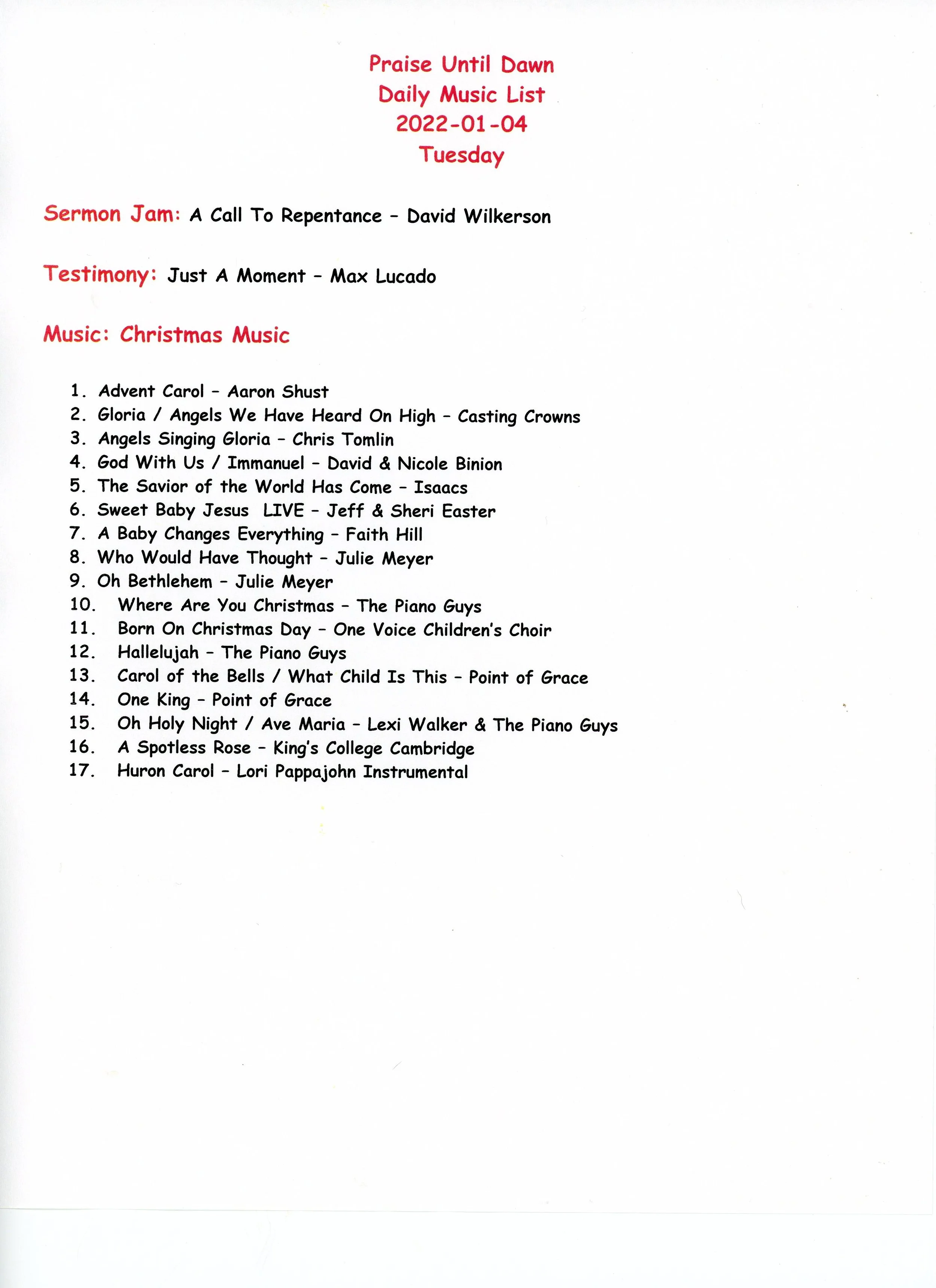 "Praise Until Dawn" Christmas Playlist Tuesday 2022-01-04 Pat RutherfordJanuary 6, 2022 Facebook0 Twitter 0 Likes
